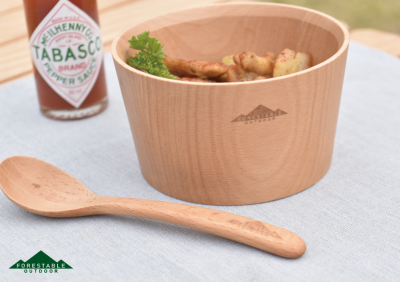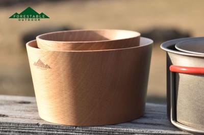 登山用品専門のメーカーと共同で開発して生まれた木製のカップ。金属製のカップの収納できるサイズ感です。粘り気のある?の特性を活かした、使い勝手の良い木製カップは料理にも飲み物にもぴったりです。熱々のスープ、炊き立てのご飯。冷たい水で作った水割りに、淹れたてのコーヒー。裏面のくぼみもあるので、片手で握りやすい形状です。