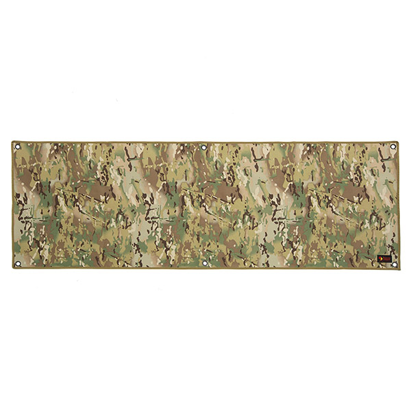 裏面に防水加工が施された横長グランドシートです。角に施されたハトメにペグ(杭)を打ち、風によるめくれ上がりを防ぐことができます。機能性に優れた、アウトドアシーンで大活躍間違いなしのアイテムです。シェルター内の荷物置き場や、コットとの相性が良いため、下に敷いてちょうど良いサイズです。