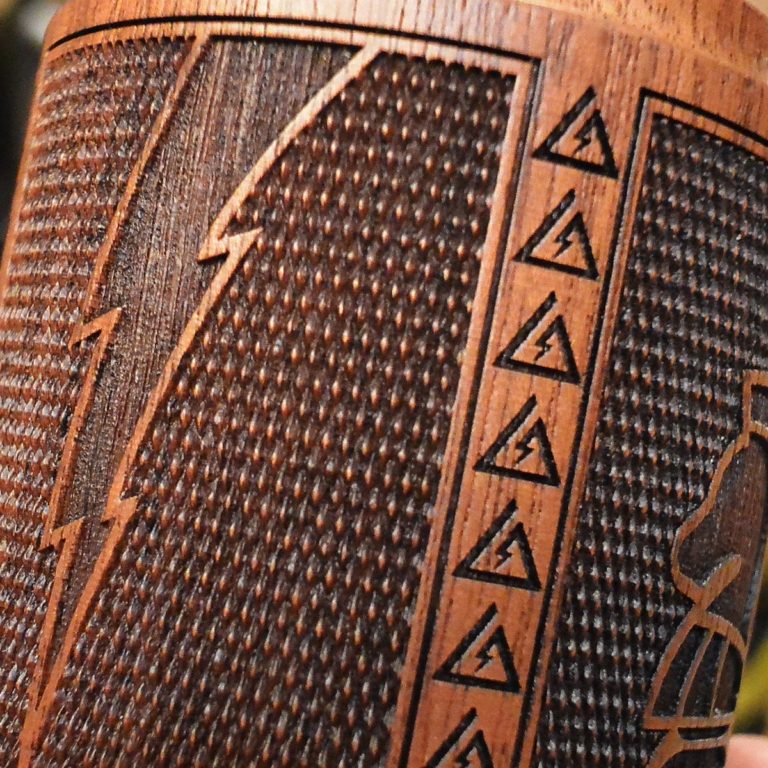 滑り止めと装飾を兼ねた表面感や精密な彫り込みによるグラフィック(弊社のロゴ2つとライトニングボルト)は惚れ惚れする仕上がりです。