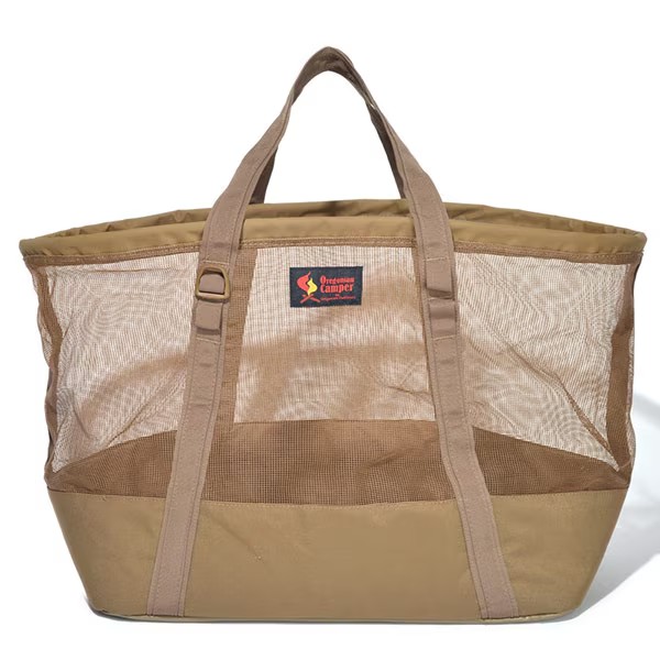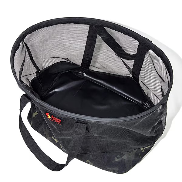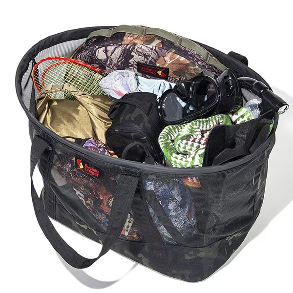 自立する大容量メッシュトートバッグ、キャンプクリール GRANDEです。ボディに採用した、張りのあるPCVコーティングメッシュは吸水しないため、濡れモノを気楽に収納することができます。中身が分かりやすいのもメッシュの特徴。開口部に内蔵したチューブにより、バッグが自立し、開口部が開くことで、使いやすいメッシュバッグを実現しました。底部には、クッション性のある素材を使用しておりますので、ダッチオーブンなどの重量物も、安心して収納することができます。シュノーケリングやスノボ、川遊びなどにもおすすめです。