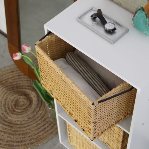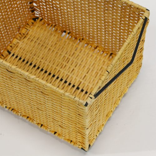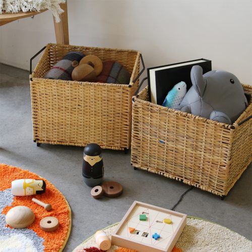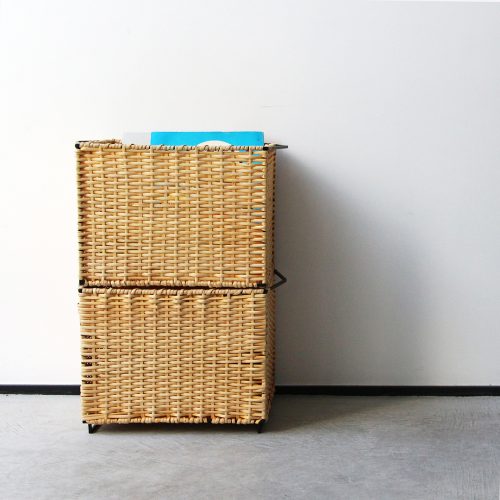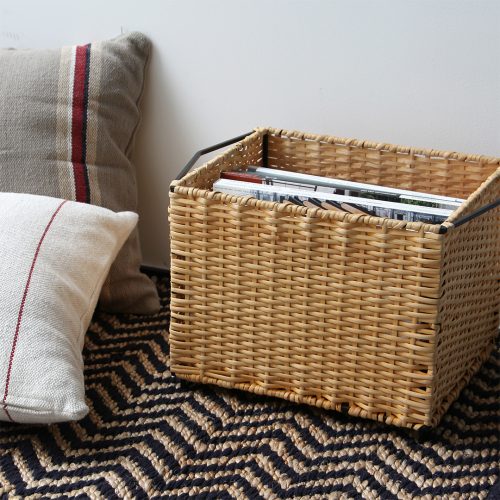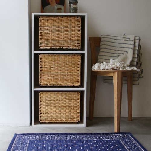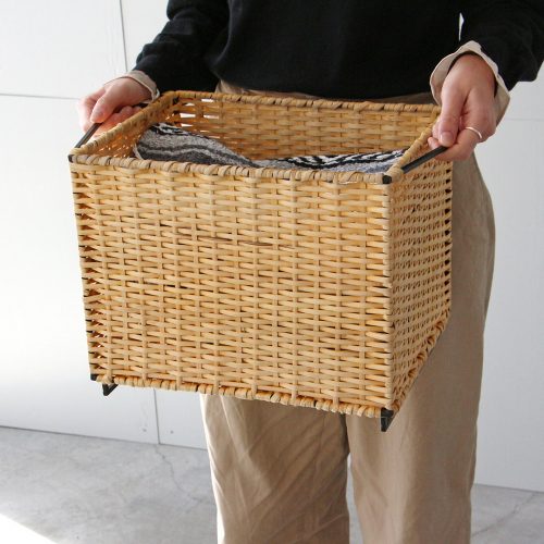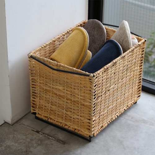 スチールフレームにラタンを編み込んだスタッキングバスケット。玄関やリビング、レストルームなど様々な場所で見せる収納、下段は隠す収納と使い分けができる仕様。市販のカラーボックスへ収納できるサイズ感もまた良い。