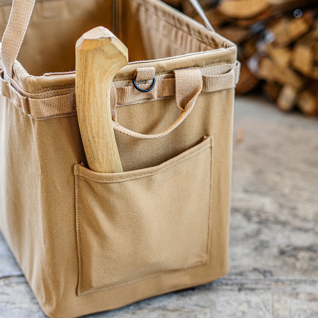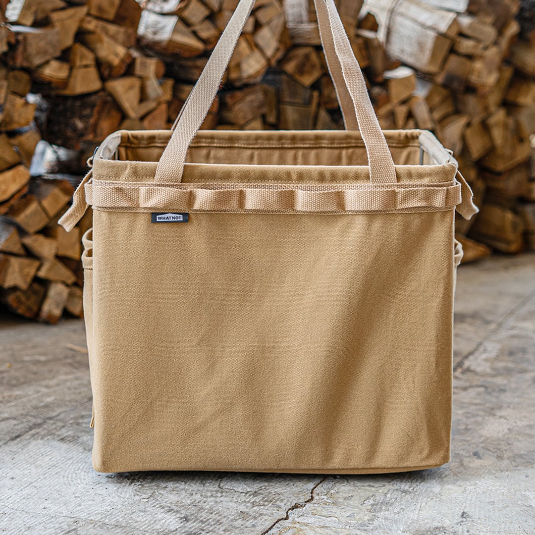 帆布素材ならではの燃えにくさはそのままに、さらに薪などのやや重めの荷物を運ぶことを想定し、フレームをHD(ヘビーデューティー)仕様に変更(経5mmのスチールワイヤー)。