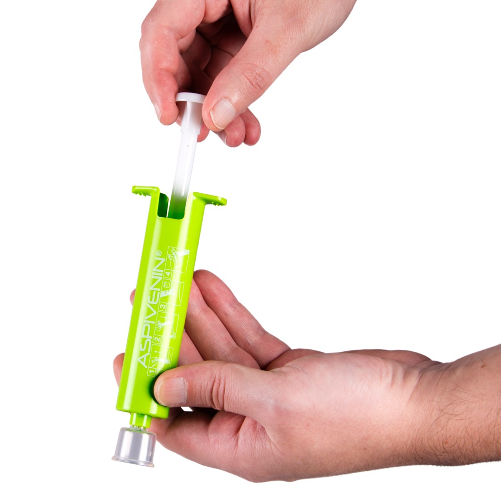 アスピブナンは毒蛇に咬まれたり、蜂、蚊、毒虫等に刺された時、毒液や毒針を吸引作用で抽出する応急手当器具です。従来のエクストラクターのフランス仕様でケースが洗練されたデザインになっています。