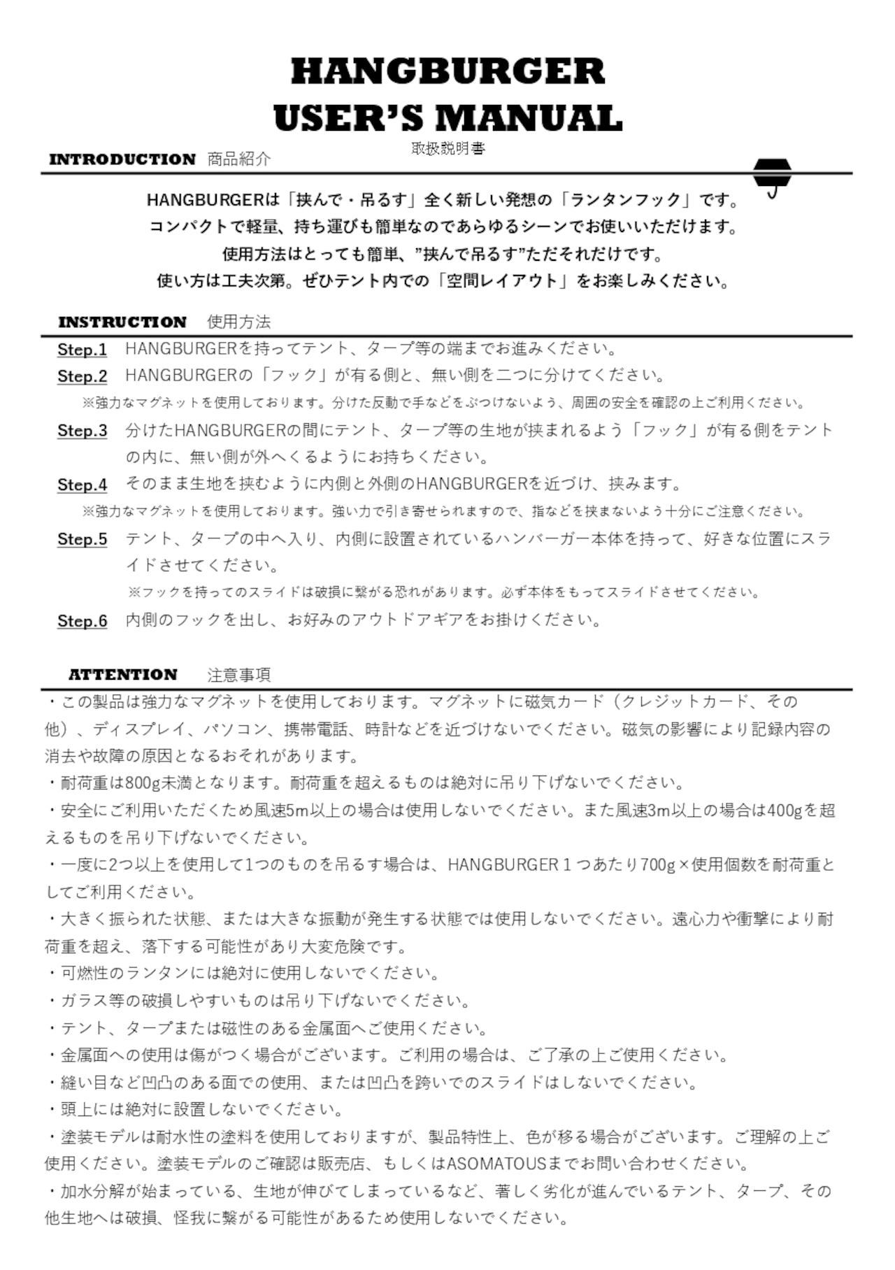 HANGBURGER(ハングバーガー)は、テントやタープの天井にLEDランタン等を設置することのできる、挟んで、吊るす新発想のランタンフックです!