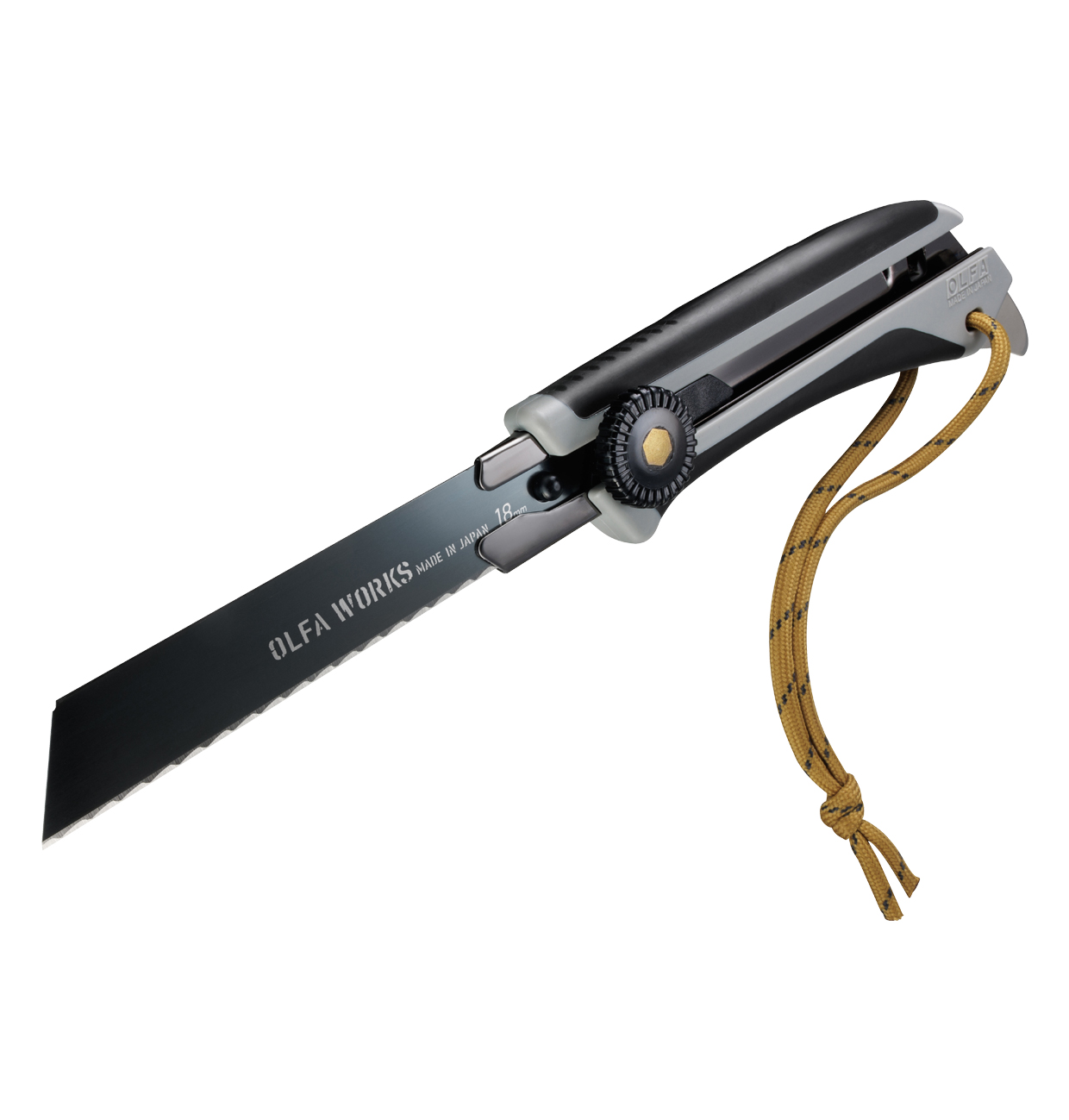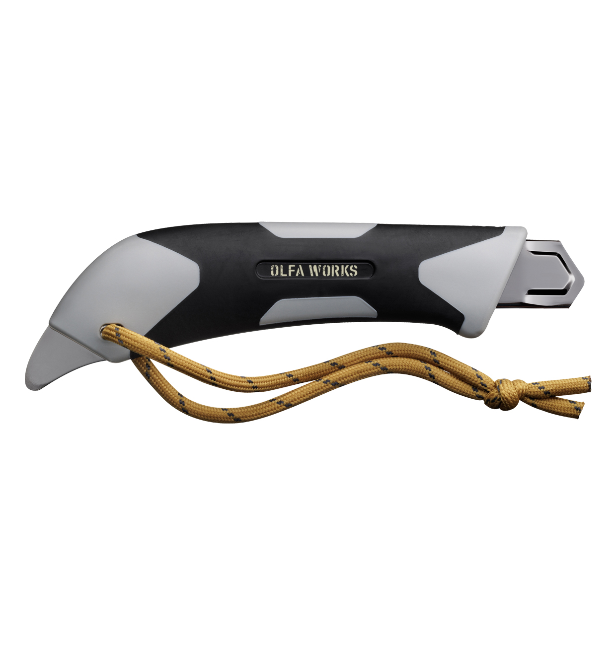 一般的なカッターナイフのような使用感ながら、波形の研磨が施されていることで、滑りやすい素材(ロープやペットボトルなど)でもしっかり引っかかりスムーズなカットが可能。本体後部には多用途に活躍する便利なツメ付き。グリップは限定色のアッシュカラー。数量限定販売。