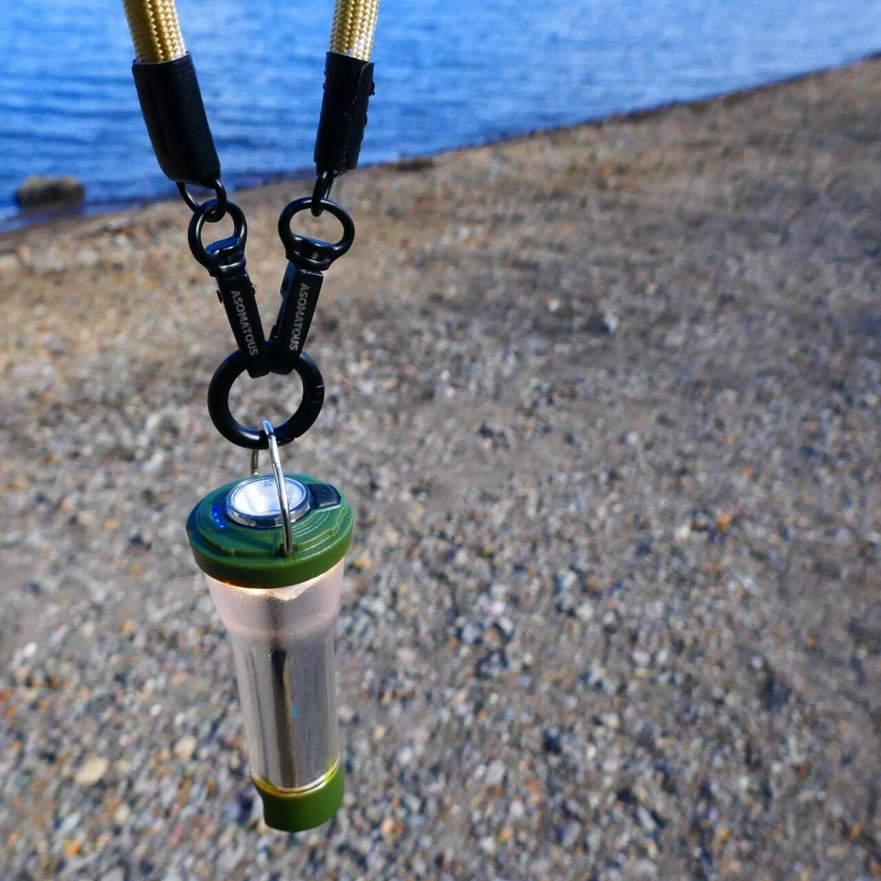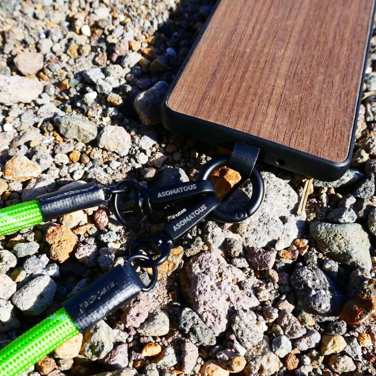 装着対象側をリングカラビナ、ストラップ両端の2点をカラビナ状にすることで、驚きの汎用性を生み出しています。