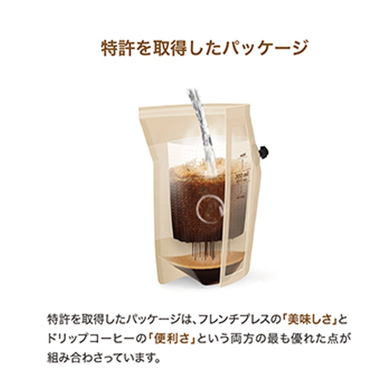 COFFEE BREWERとは、フレンチプレスやドリップで抽出したのと同じ「深みとコクのある美味しい品質」とインスタントコーヒーのようないつでもどこでもお湯だけで簡単に淹れることのできる「手軽さ」の2つが実現した画期的なアイテムです。