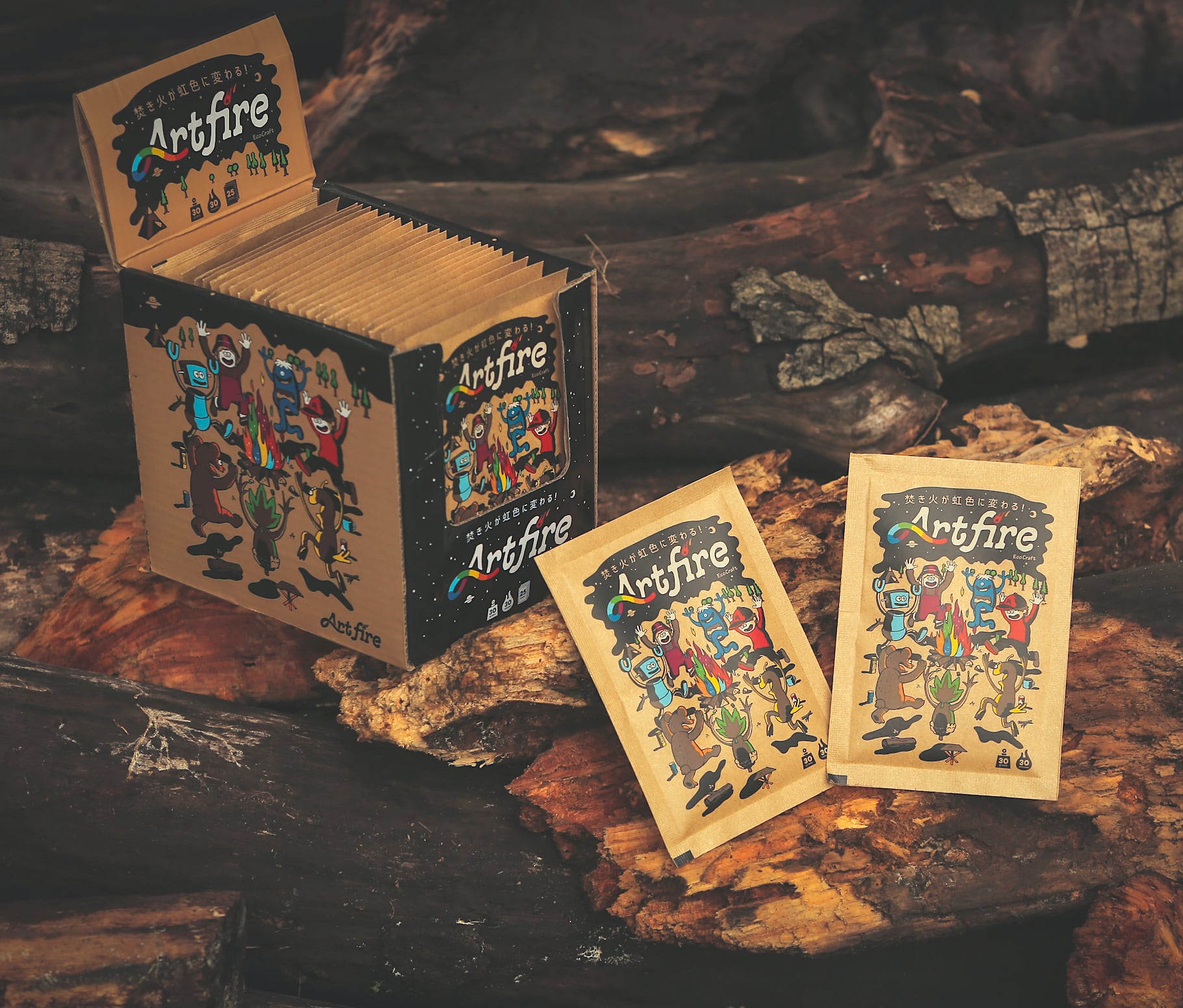 炎色反応剤は自然界に存在する成分(炭酸カルシウム / シリカ/デンプン/ 青色1号 / タートラジン等)をベースに調合し、 袋はそのまま燃やしても有害物質の出ないクラフト紙+アルミ蒸着の袋を採用。