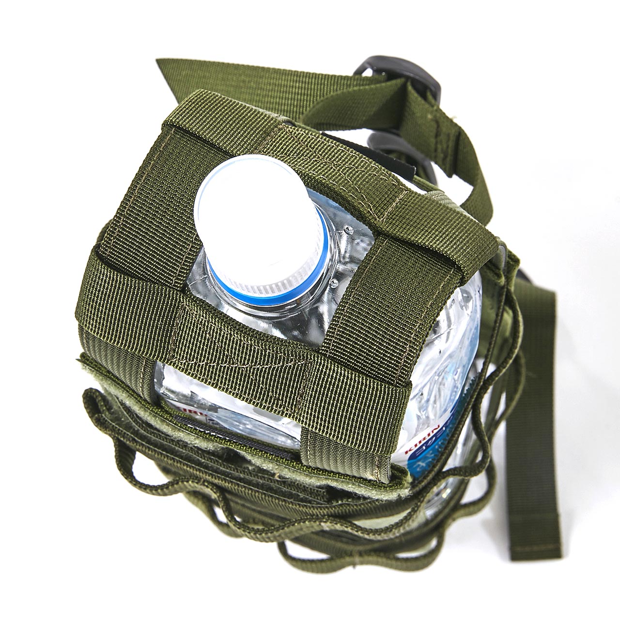 縦横寸はベルクロにより形状やサイズ変更ができます。又、底部分の開き止めを兼ねた2本の横渡しベルトはスライド出来ますので、真下位置にに開口部を作りペットボトルを逆さにして100均やAmazonで買えるペットボトル用キャップ(引くと出て、押し込むと止まるキャップ)を付けていただくと「吊り下げ式簡易ジャグ」にもなります。バイクに乗られる方は背面2本上部1本のストラップを利用して予備燃料ボトルのホルスターとしてもご利用いただけます。
