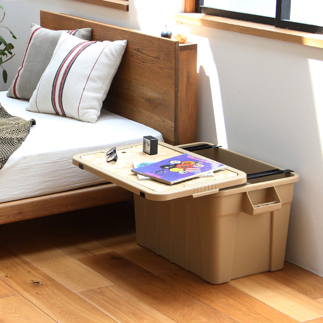 2本のレールを蓋を開けた本体両端に装着し、蓋はレールの上部にはめ込むだけの簡単な仕様でありながら格段に便利になります。アウトドアシーンではもちろん、室内ではサイドテーブル使用としても活躍します。
