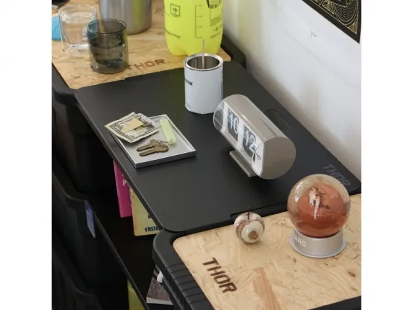 天板としての使用はもちろん、同じ高さに揃えたTHOR LARGE TOTESに橋渡しにしてテーブルやカウンターを作ることができる。(橋渡しの場合は22Lも対応)
