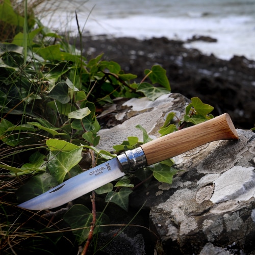折りたたみ可能で、使用時・収納時ともに刃を固定できる「ビロブロック(OPINEL 独自の安全ロック機構)」付き。