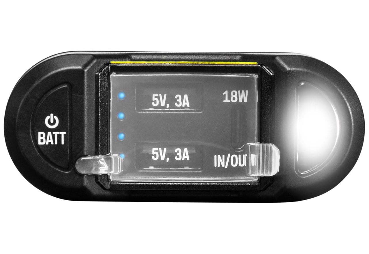 内蔵バッテリーの充電状況、接続デバイスの充電状況がひと目で分かるインジケータを搭載