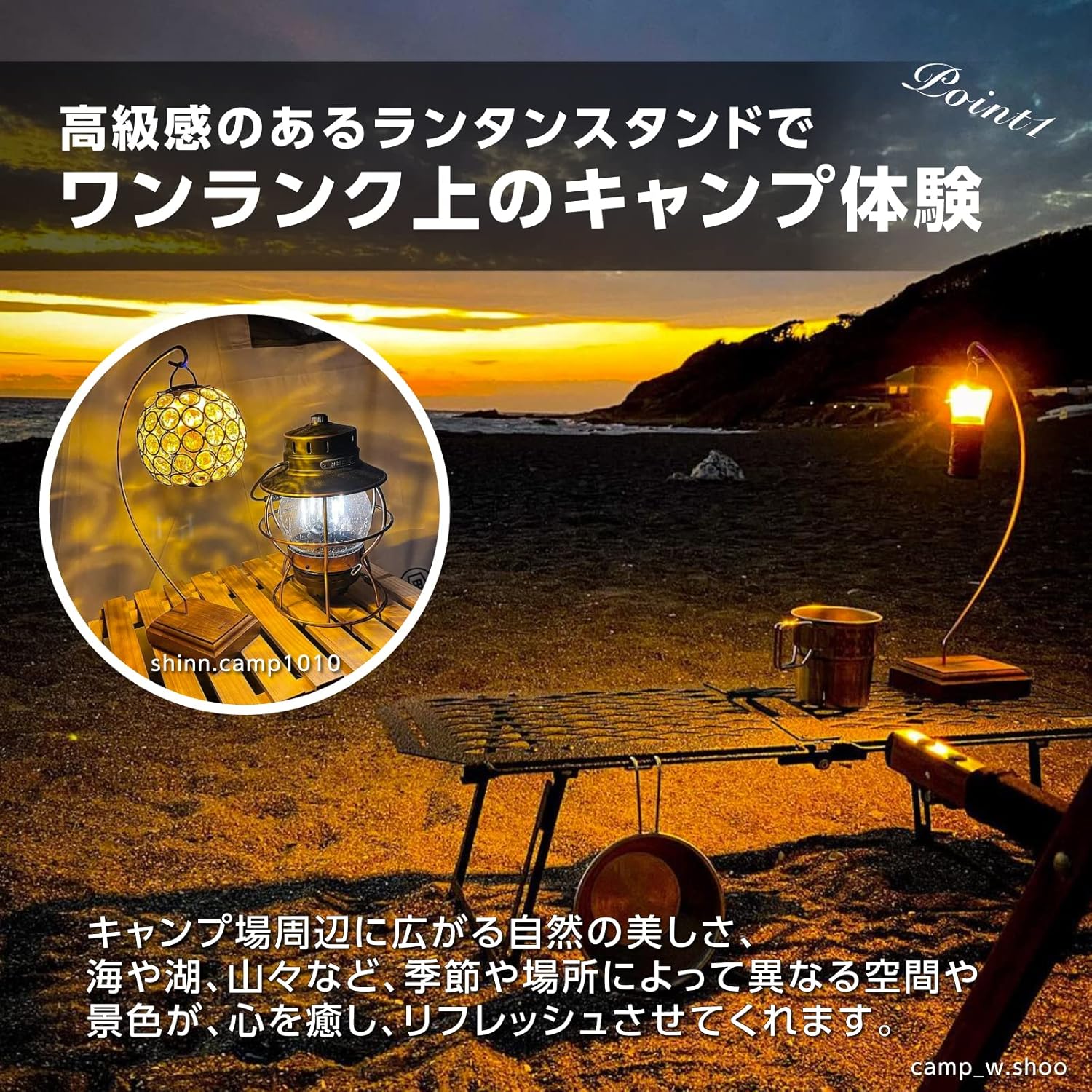 「卓上に明かりを置ける!キャンプサイトをロマンチックに演出する」ランタンを吊るすことができるので、卓上に明かりを置くことができます。また、スタンドを使用することで、ランタンの明かりをより安定させることができます。キャンプサイトでは、ロマンチックな雰囲気を演出することができます。