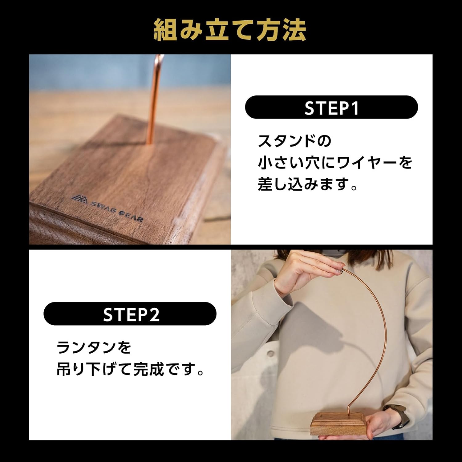「アンティーク風スタンド」ウォールナットの台座に銅のアングルでできた、おしゃれなデザインのランタンスタンドです。2つのタイプがあり、半円形の「Semicircle」と弓形の「Bow」があります。どちらのタイプも、高級感のあるデザインで、キャンプサイトや室内でのインテリアとしても活躍できます。