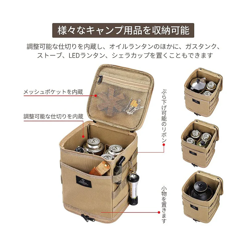 【大容量、多機能】Thous Windsレイルロードランタン、ファイヤーダンスストーブの収納にぴったり。他ブランドのオイルランタン、ガスタンク、コンロ、LEDランタン、シェラカップ等、大容量で様々な製品が収納可能。内部には便利な仕切りがありマジックテープ仕様なのでお持ちのギアに合わせて自由に調節することができます。内側には視認性があるメッシュポケットや、両サイドにループ付きのため、吊り下げ収納も!