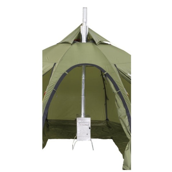フロントのすべてのジッパーを開くことで野外にいるような開放的なスペースが確保できます。また、天井には煙突を付けるスペースがあり、煙突付き薪ストーブなどが使用できます。