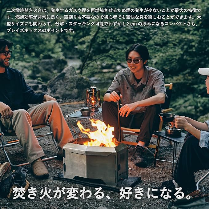 燃え切らなかった未燃焼ガスを、再度燃焼させることで煙を軽減し、快適な焚き火を楽しめます。