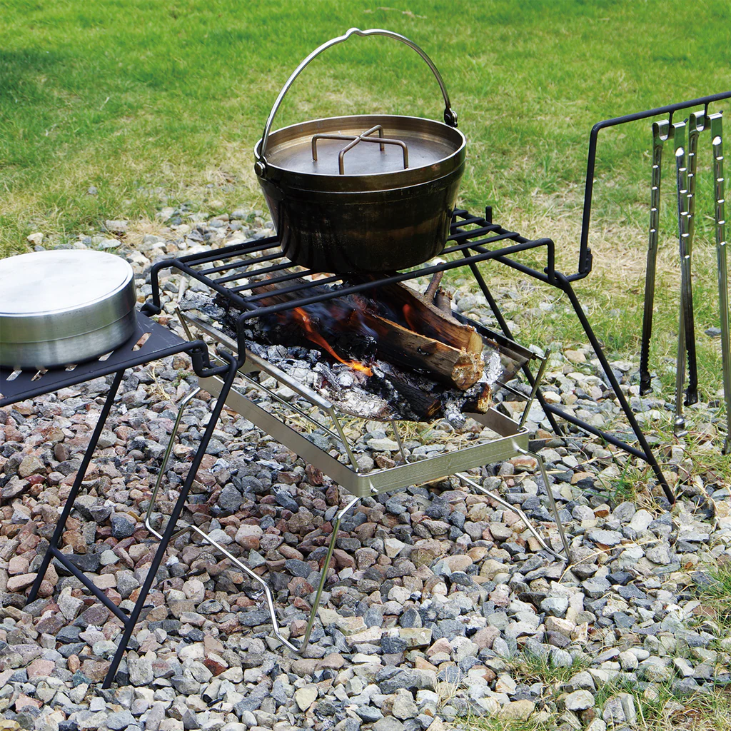 焚き火台に合わせて高さが変えられるアイアンスタンド。