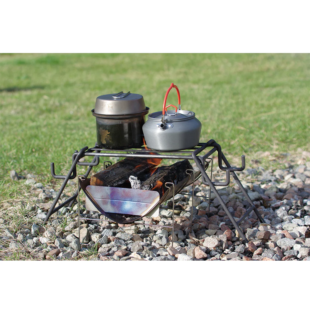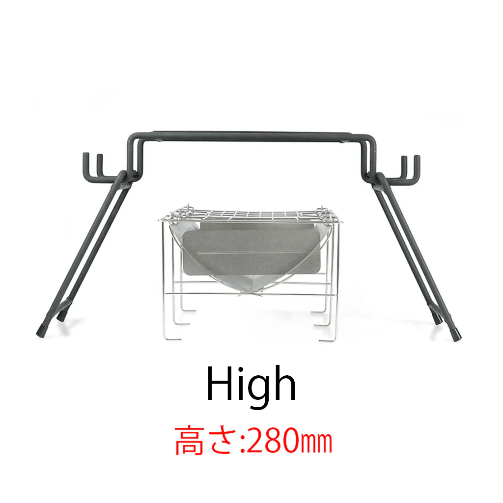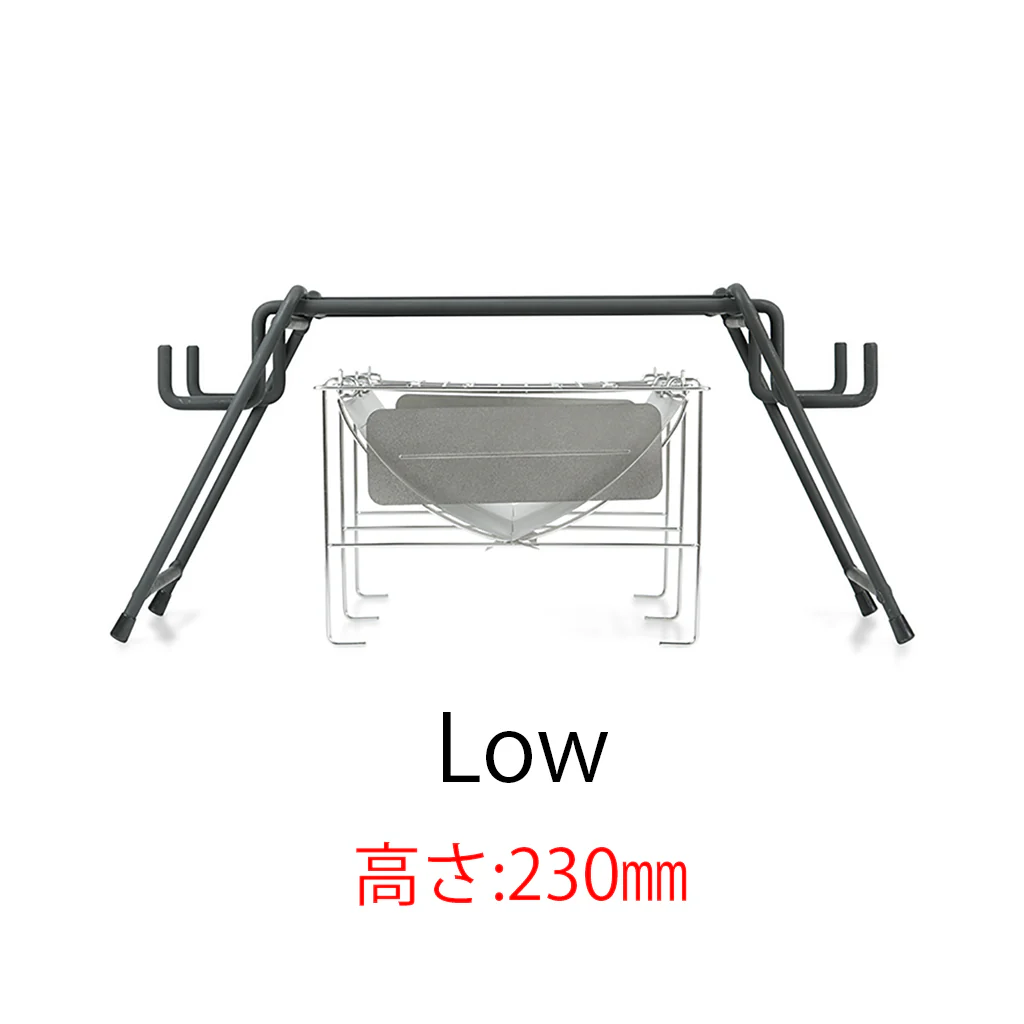 ウッドストーブや小型の焚き火台にジャストサイズ。脚をセットする位置を変えるだけでお使いの焚火台に合った高さに変えられます。また、収納時の高さは7cmになります。