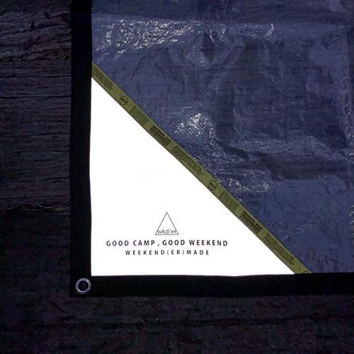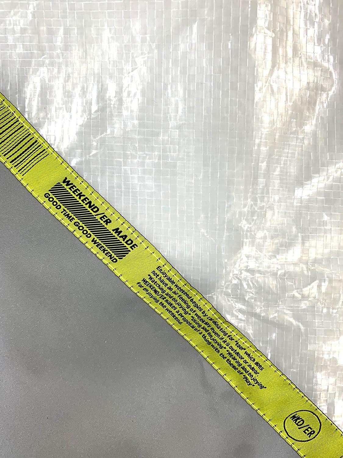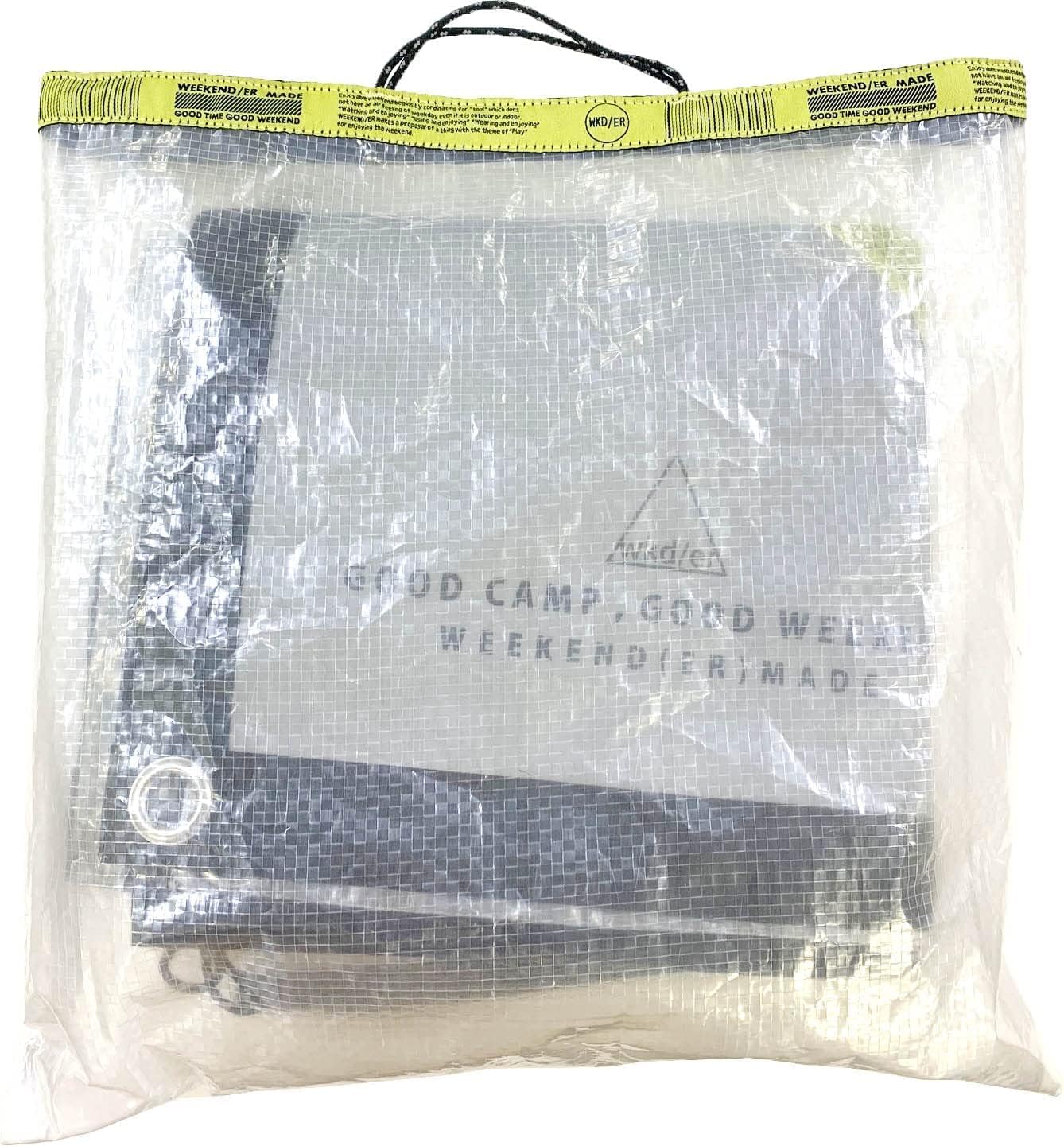 水に強く、引き裂きに強い、汚れが付きにくいPE(ポリエチレン)素材を使用し、マルチに使えるシートを作りました。 発売中のキャンプアイテムパッキングシリーズと同じ素材、WEEKEND(ER)のロゴテープとリフレクション生地を使用しています。 キャンプ時の荷物の積み下ろしの際に地面に敷き、汚れを防ぎ、車内やテント内に入れるものを汚さないようにします。 四隅にはハトメ、辺の中央にはリフレクションコードでループを付けており、シートが風で飛ばされないようペグ等で地面に固定が可能です。 リフレクション生地を三角形に縫い付け、夜間の視認性を高めています。 広げてグランドシート代わりにしたり、必要な大きさに畳んで汚したくないものの下に敷いたり、簡易的な雨除けとして使ったりと、1枚あると重宝するマルチに使えるアイテムです。