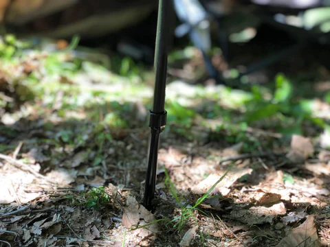 地面に固定する場合は、ペグを地面に打ち込み、ジョイントとペグをつないで設置。ジョイントはお好みの高さに合わせて必要数使用してください。