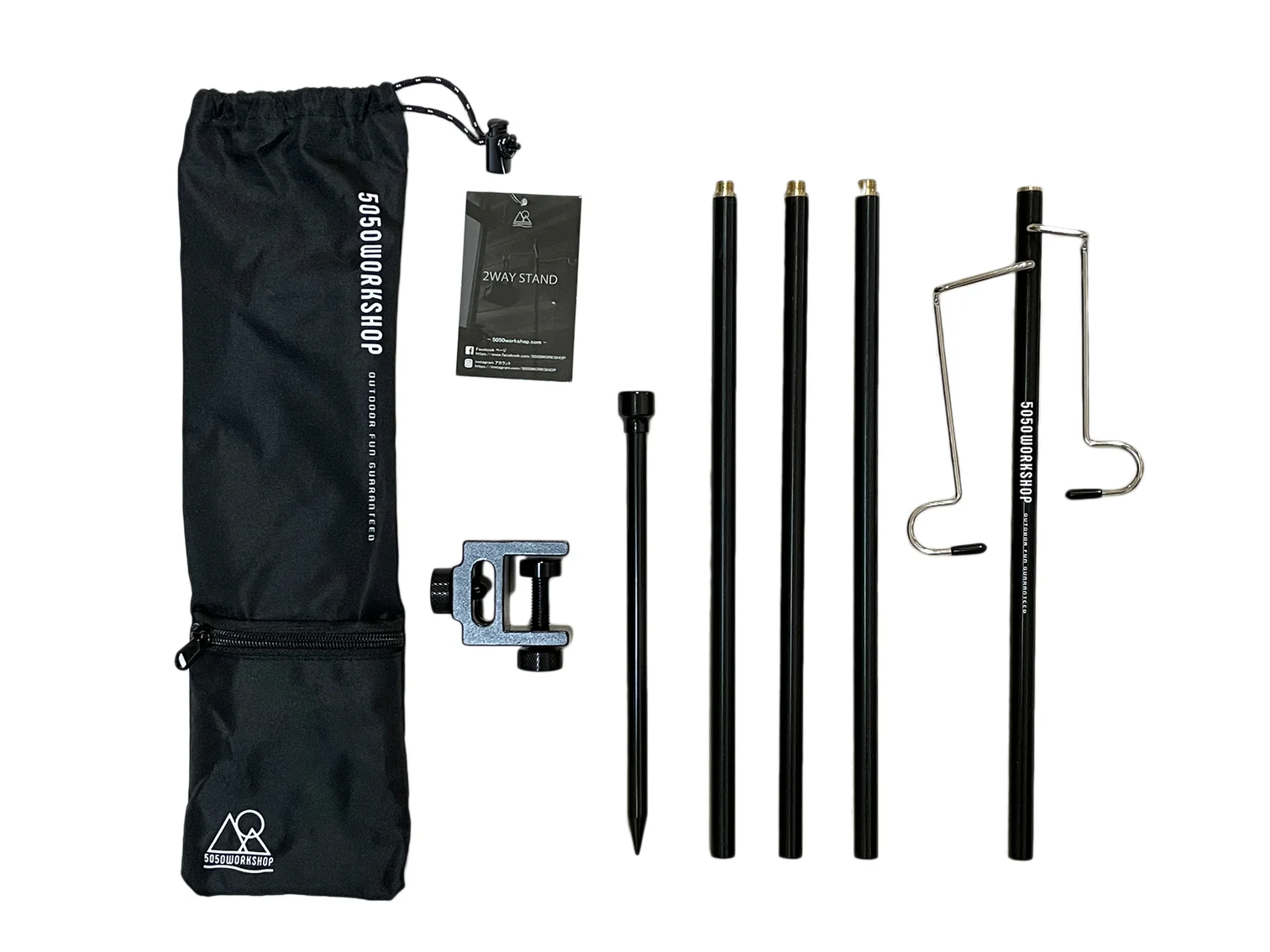 2WAYSTANDはテーブルに挟んで固定、もしくは地面にペグを打ちこんで固定と様々なシーンで使用できるランタンスタンドです。
