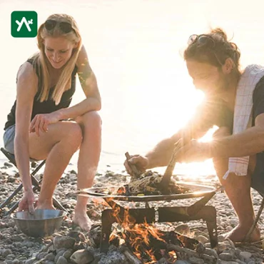 フラットに折りたたむことが可能な焚火用グリルスタンドです。付属の焼き網をセットしてのグリル料理や、オープンファイアパンSと組み合わせ鉄板料理を楽しむことができます。火の状態を見てアームを伸ばし焼き網を載せる高さを調整することも可能です。