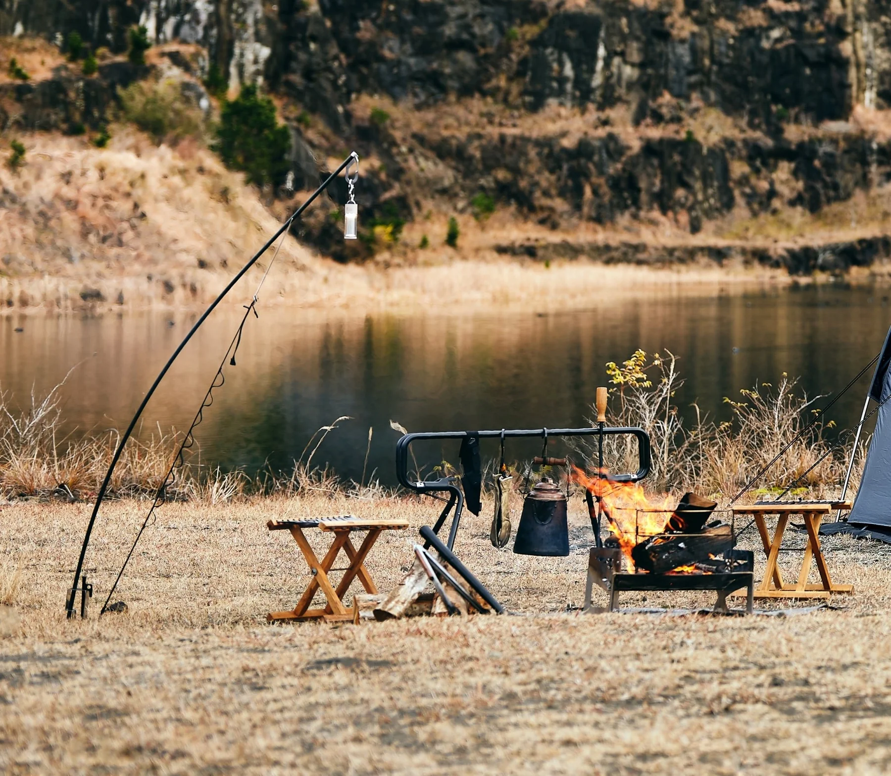 湾曲形状の利点を生かしてテーブル上にランタンを灯したり、邪魔な場合はロープのテンションを緩めて