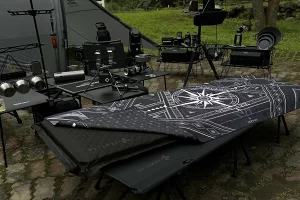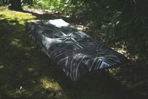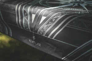 羅針盤をモチーフにした幾何学デザイン、VENTLAXロゴを全面に散りばめたモノグラムデザインのリバーシブルデザインはどちらを使ってもキャンプ場で大注目間違いなし。