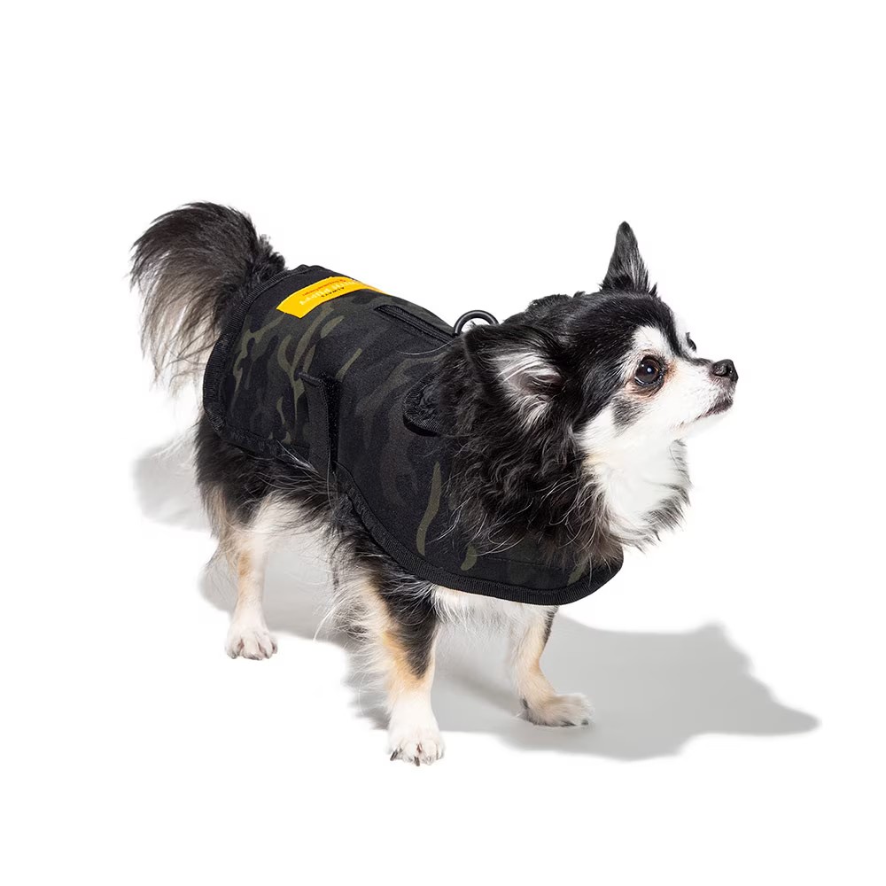 愛犬を格好良くドレスアップする、ドギージャケットです。3~5kg程度の超小型犬向け。オレゴニアンのギアやバッグにも使われている、タフな生地を使用しています。カラー付きで、裏面キルト仕様。ハーネス型リードも使用できる、背面ジッパー付きです。