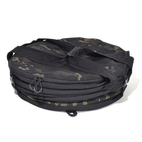 ポップアップ(折りたたみ)式の、ストーブバッグです。直径40cm×高さ50cmまでの灯油ストーブを収納でき、フォーム入りのボディが衝撃からストーブを守ります。内側の底には、万が一、燃料が漏れても安心な、防油加工トレーが付属。また、トラッシュボックス(ごみ箱)としても使えるように、ゴミ袋固定用のスナップボタンが付いています。