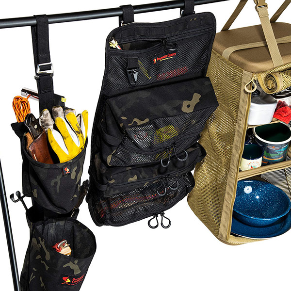 カトラリーや調理器具を入れ、クルッと巻いて収納できる、シェフズロールです。開いた状態でツールハンガーなどに吊して使うこともでき、必要な物をすぐに取り出せます。それぞれのバッグは取り外し可能で、単体でポーチとして使うこともできます。