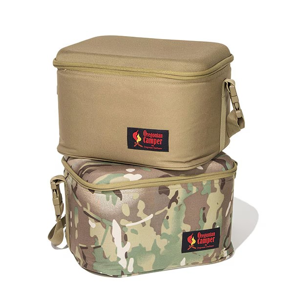 日本の伝統的なオカモチをオレゴニアン風に仕立てた、タクティカルオカモチです。天面はセミハード仕様で、中身をしっかりと保護します。蓋を外せる仕様になっておりますので、狭いテーブルの上に載せて使用しても、蓋が邪魔せず便利に使うことができます。さらに、外した蓋はトレーとしてもお使いいただけます。仕切り板は7枚あり、細かく整理整頓できるのも嬉しいところ。オレゴニアンキャンパーのカトラリートレーがすっぽり入りますので、食器&カトラリー入れとしても活躍できそうです。