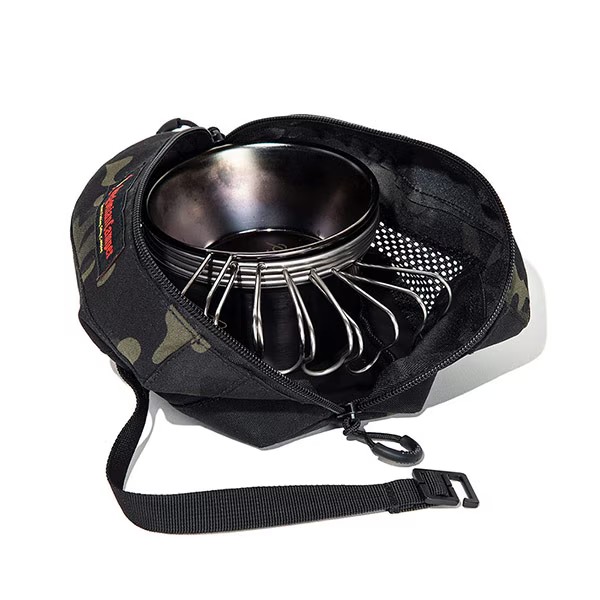 シェラカップを10個程度収納でき、ハンドルまで収まるシェラカップケースです。取り出しやすい、センタージッパーを採用。サイドにはメッシュ生地を配し、乾きやすい仕様になっています。