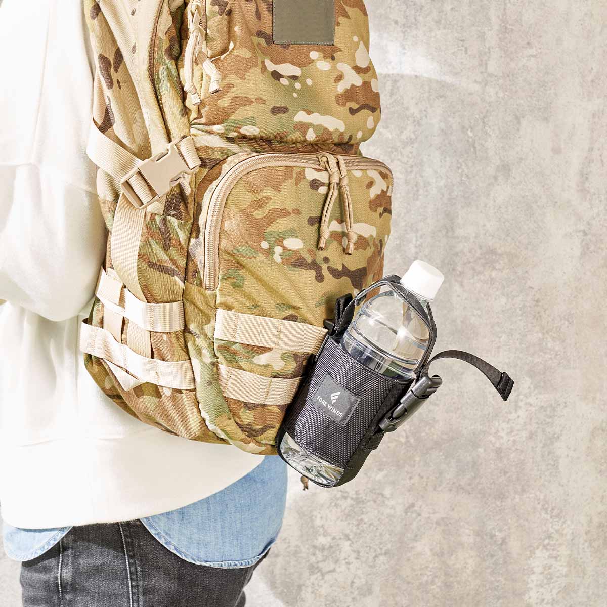 ■ペットボトルや水筒も収納する事ができます。アネックスクリップを利用し、バックパックへの取付も可能。