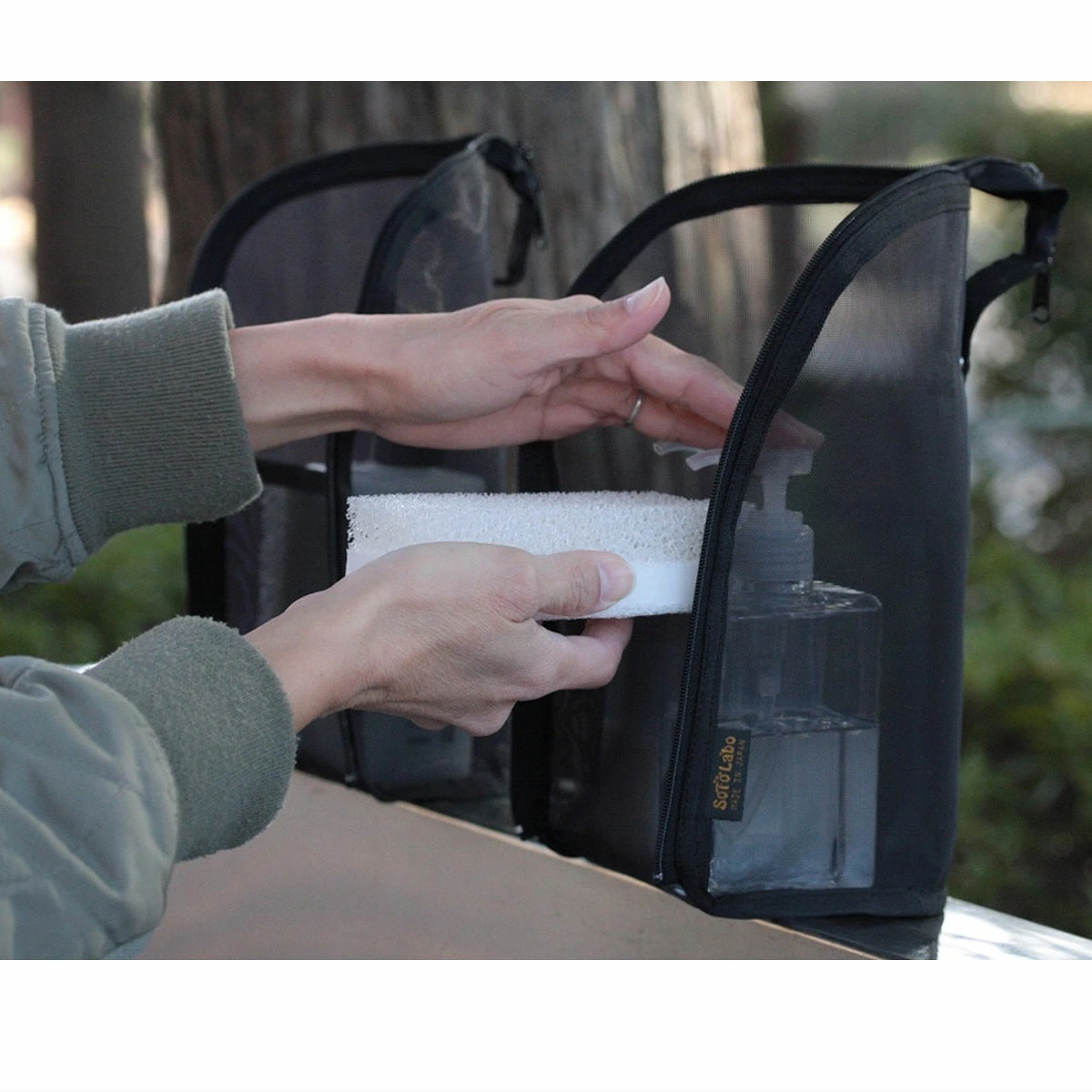 コンセプトは、屋外での洗い物の際に洗剤・スポンジを濡れたまま仕舞えて乾燥出来るメッシュケース。
