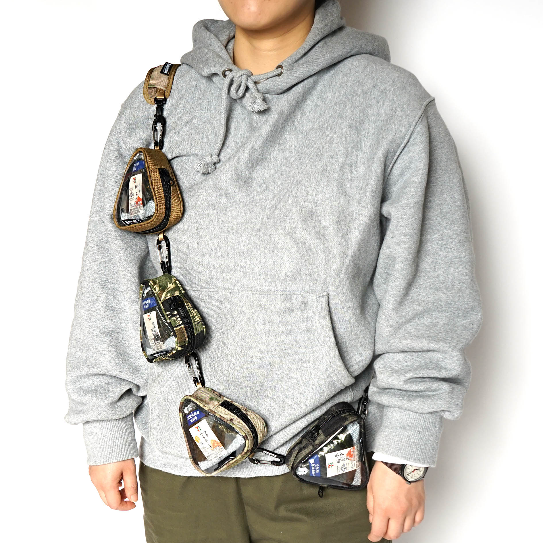 又、バックパックのショルダー部分によくあるウェビングに通してカラビナ等を併称いただきますと両肩にマウント出来ますので行動食入れにも最適です。