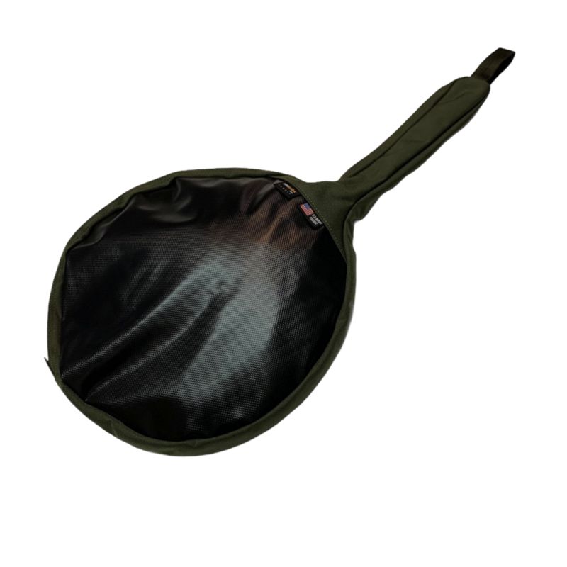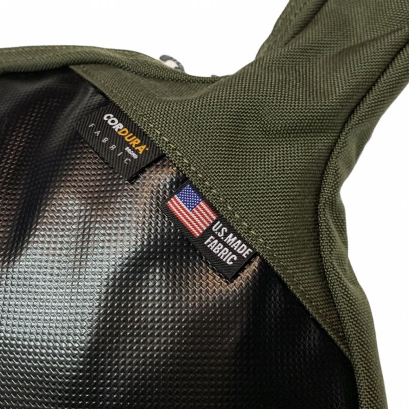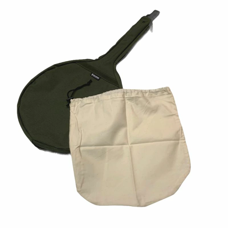 ハンドル先端に通気穴とブラ下げ用のテープループを配置。底面は地面に置いた際の汚れを拭き易いようにターポリン素材としました。